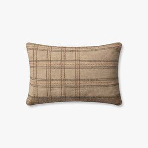This cozy throw pillow by Loloi features plaid and stripe patterns in an earth-toned palette of tan, slate-gray, and muted terracotta red. The pillow is made of polyester and cotton and measures 16" x 26", a versatile size to style in living rooms and bedrooms.